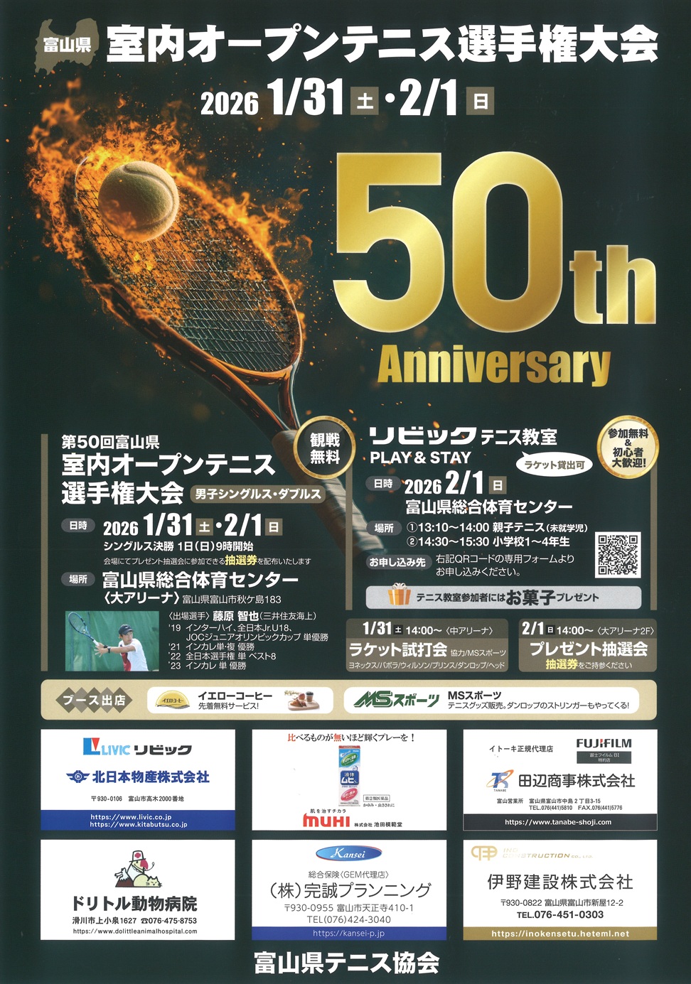 紹介 第50回 富山県 室内オープンテニス選手権大会 2026年1月21日 2026年1月31日(土)・2月1日(日)に、 「第50回 富山県 室内オープンテニス選手権大会」が富山県総合体育センターにて行われます。 2月1日は親子テニス(未就学児)・小学1~4年生対象のテニス教室も開催されます。 参加無料!ラケット貸出有りです。 その他にも、ラケット試打会・プレゼント抽選会・ブース出店などございます。 ぜひご観覧・ご参加ください(^^♪ Facebook postはてブLINEPocketFeedly